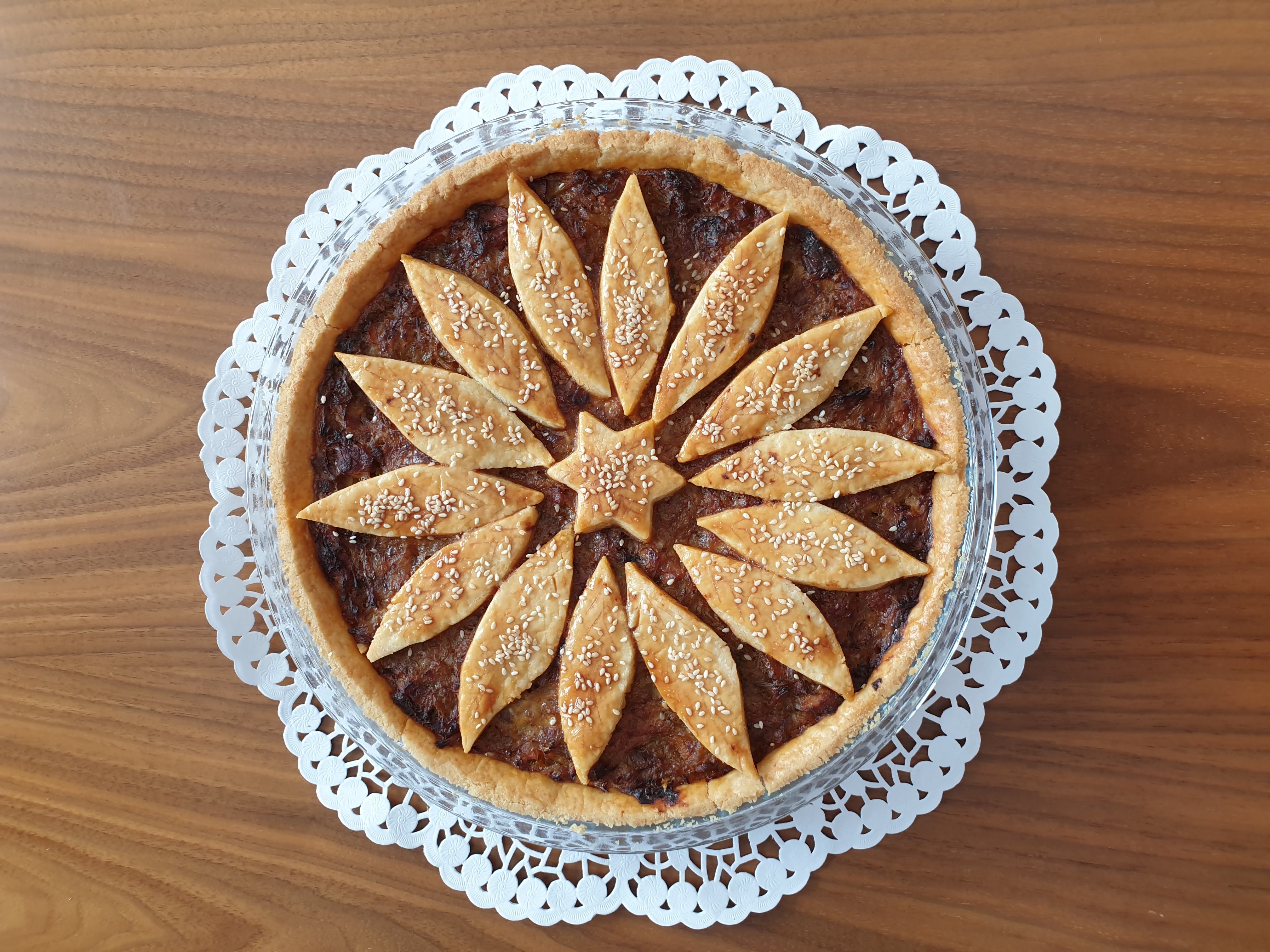 Kapustę poszatkować, marchewkę zetrzeć. Kapustę dusić z żeberkami. Boczek pokroić w drobną kostkę i podsmażyć. Dodać do uduszonej kapusty. Na tłuszcz, który zostanie z boczku dodać pokrojoną cebulę i 1 łyżeczkę mąki. Lekko podsmażyć i dodać do kapusty. Doprawić solą, pieprzem i majerankiem lub ulubionymi przyprawami. Mięso z żeberek obrać, pokroić w kostkę i dodać do kapusty. Wyjąc z lodówki formę wypełnioną ciastem i nałożyć do niej nadzienie z kapusty. Na wierzch ułożyć wycięte listki. Za pomocą pędzelka posmarować wierzch ciasta roztrzepanym jajkiem i posypać sezamem. Piec w 170 st. C, około 45 – 50 minut. Podawać na ciepło lub zimno. Smacznego!