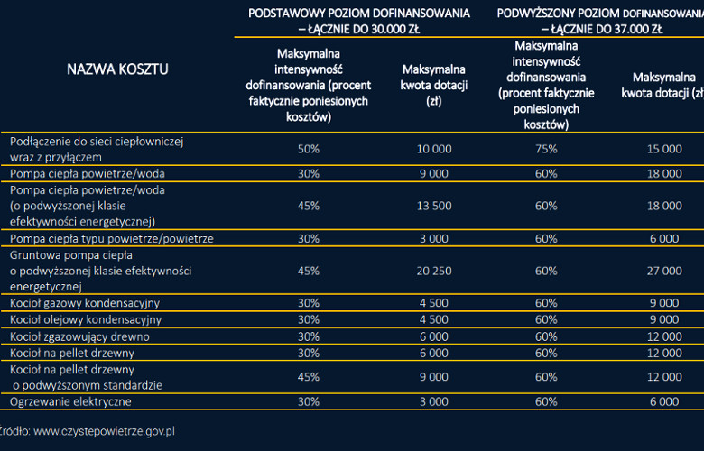 najbardziej zaawansowanego technologicznie, a więc bardziej ekologicznego. Od pierwszego stycznia 2022 roku po zmianach w programie „Czyste Powietrze”, Narodowy Fundusz Ochrony Środowiska i Gospodarki Wodnej, a za nim WFOŚiGW nie udzielają już dopłaty do kotła opalanego węglem zostały przesunięte na dofinansowanie termomodernizacji. Tym samym więcej osób będzie mogło skorzystać z podwyższonego dofinansowania tego typu przedsięwzięcia. Będzie to do 37 tys. zł bezzwrotnej dotacji na 1 obiekt.
