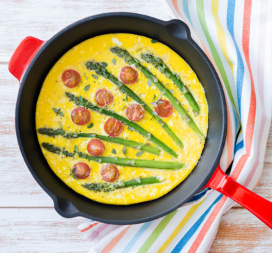 Składniki: 300 g szpinaku, pęczek zielonych szparagów, ząbek czosnku, łyżka masła, 3 łyżki śmietany, 4 jaja, łyżka mleka, 2 łyżki startego parmezanu lub innego sera, szczypta gałki, sól, pieprz. Wykonanie: szpinak i szparagi umyć. Pokroić w kawałki szparagi, zblanszować ok. 4 minuty we wrzątku. Szpinak wraz z czosnkiem podsmażyć na maśle, dodać szparagi i śmietanę, przyprawić. Jaja roztrzepać z łyżką mleka i wlać na rozgrzaną patelnie. Kiedy omlet się zetnie na połowę nałożyć nadzienie, następnie złożyć go na pół. Po zdjęciu na talerz posypać wiórkowanym serem.