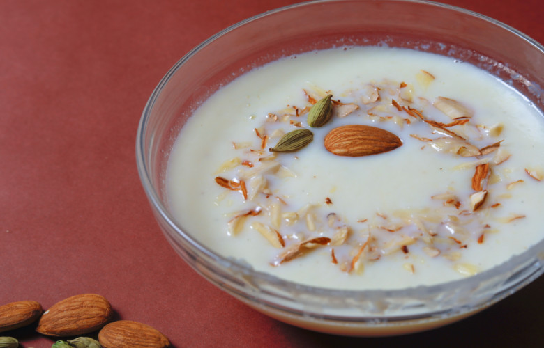 Wykonanie: migdały sparzyć i obrać z łupinek, 10 sztuk odłożyć, resztę dokładnie osuszyć, zemleć lub zetrzeć zakraplając mlekiem lub wodą, by zapobiec wydzielaniu się oleju, zalać wrzącym mlekiem i gotować na małym ogniu przez około 15 minut; na talerze włożyć ryż (np. po 2 łyżki na osobę) i zalać mlekiem migdałowym; odłożone migdały grubo posiekać i wrzucić